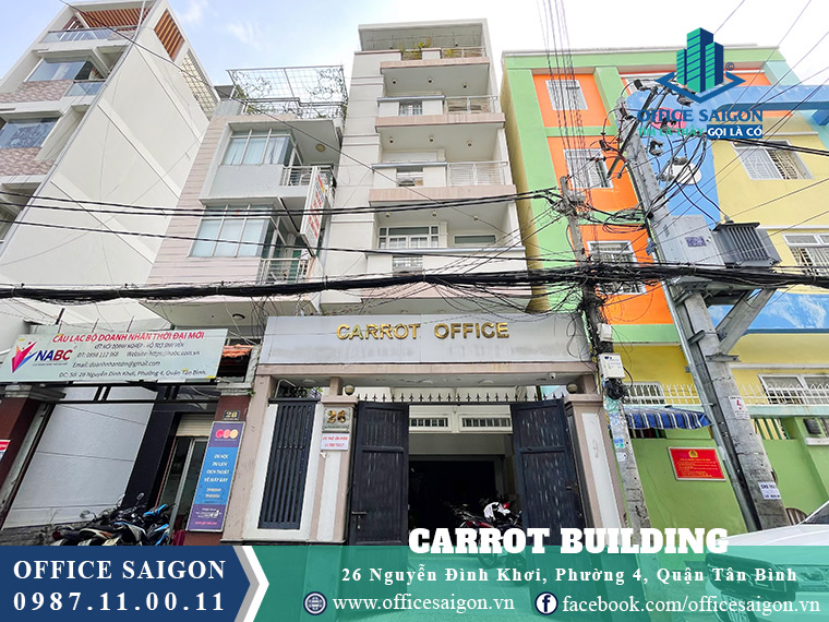 Carrot building, 26 Nguyễn Đình Khơi, phường 4, quận Tân Bình là một trong những tòa nhà văn phòng nổi bật tại khu vực Tân Bình. Tọa lạc trên đường Nguyễn Đình Khơi, tòa nhà này có vị trí thuận tiện, giúp di chuyển dễ dàng đến các khu vực trung tâm của Thành phố Hồ Chí Minh và sân bay Tân Sơn Nhất. Carrot building cung cấp nhiều diện tích văn phòng đa dạng từ 16m² đến 50m², với giá thuê hợp lý từ 8.7 USD/m² đến 9.7 USD/m², phù hợp với các doanh nghiệp vừa và nhỏ.