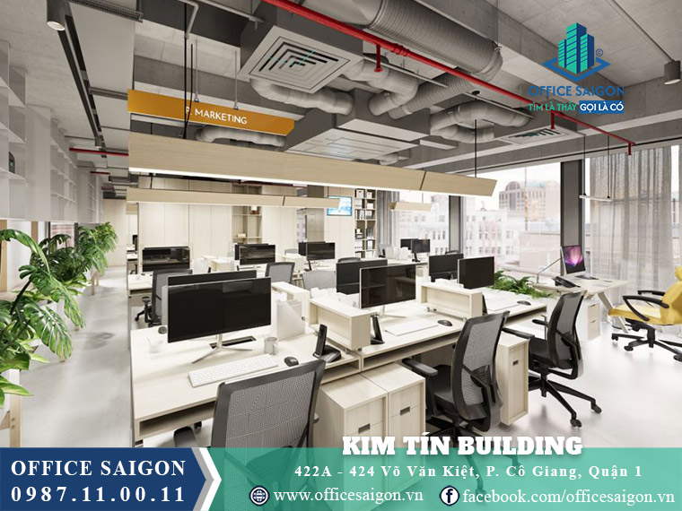 Kim Tin Building located at 422A - 424 Vo Van Kiet, Co Giang Ward, District 1. The building facing to Vo Van Kiet street, Ho Chi Minh City's central artery, offers a prime office location by Tau Hu and Ben Nghe canals. Strategically positioned at the western gateway to the city center, it ensures seamless connectivity. This location ensures seamless connectivity and convenience for businesses. With competitive rental prices, the building is ideal for office workers, directors, and HR teams seeking a professional, well-equipped workplace.
