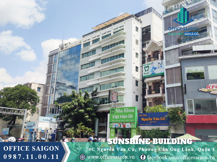 Sunshine Building is located at 74C Nguyen Van Cu Street, Ong Lanh Bridge Ward, Ho Chi Minh City. It enjoys a prime location near major and key roads of District 1 such as Tran Hung Dao, Vo Van Kiet, and Nguyen Trai. Positioned in a bustling residential area, the building is close to shopping centers, office towers, and offers convenient access to District 5, District 3, District 4, and other neighboring districts. Its strategic location also places it near administrative zones, banks, commercial centers, Grade A office buildings in District 1, restaurants, hotels, and major domestic and international companies.