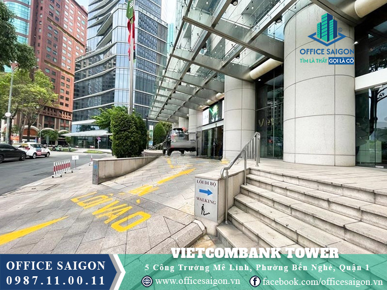 Vietcombank Tower, located at 5 Me Linh Square, Ben Nghe Ward, District 1, Ho Chi Minh City. This is one of the most prestigious Grade A office buildings in the city's central business district 1 and 4 with the front direct to the main roads. Its strategic position makes it a top choice for multinational corporations and financial institutions.